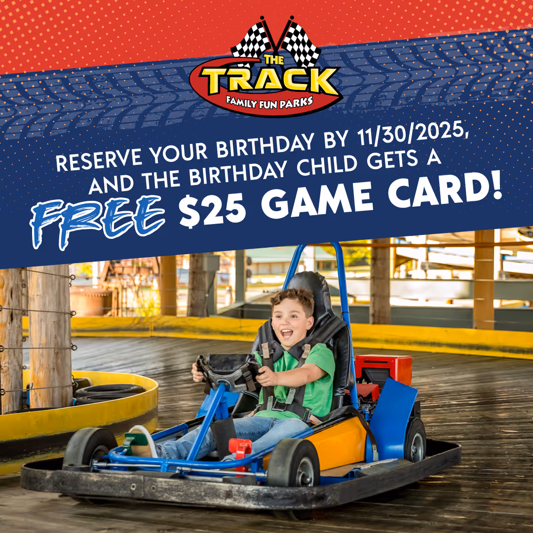 Get a FREE $25 Game Card for the birthday child when you reserve your party by 11/30/25